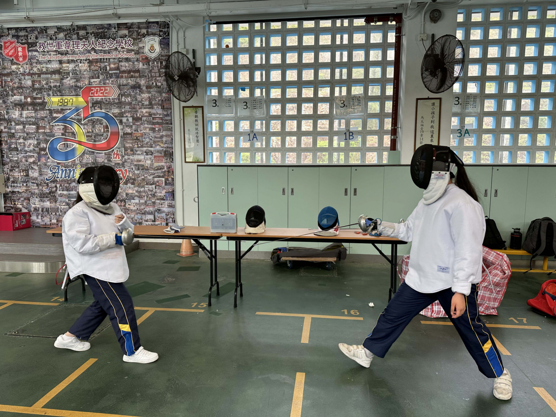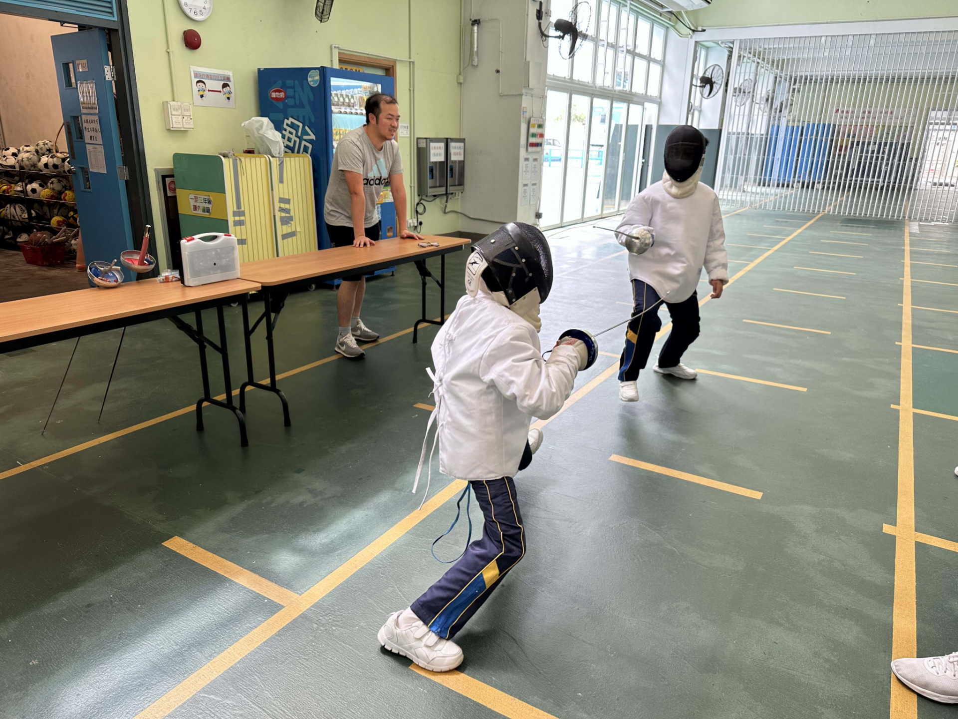 上課的時候,學校雨天操場搖身一變成為一個劍擊場,在專業的教練帶領之下,除了為學生介紹劍擊器材、服裝、基本技術及比賽規則之外,更安排不同練習,讓同學初步嘗試接觸劍擊。